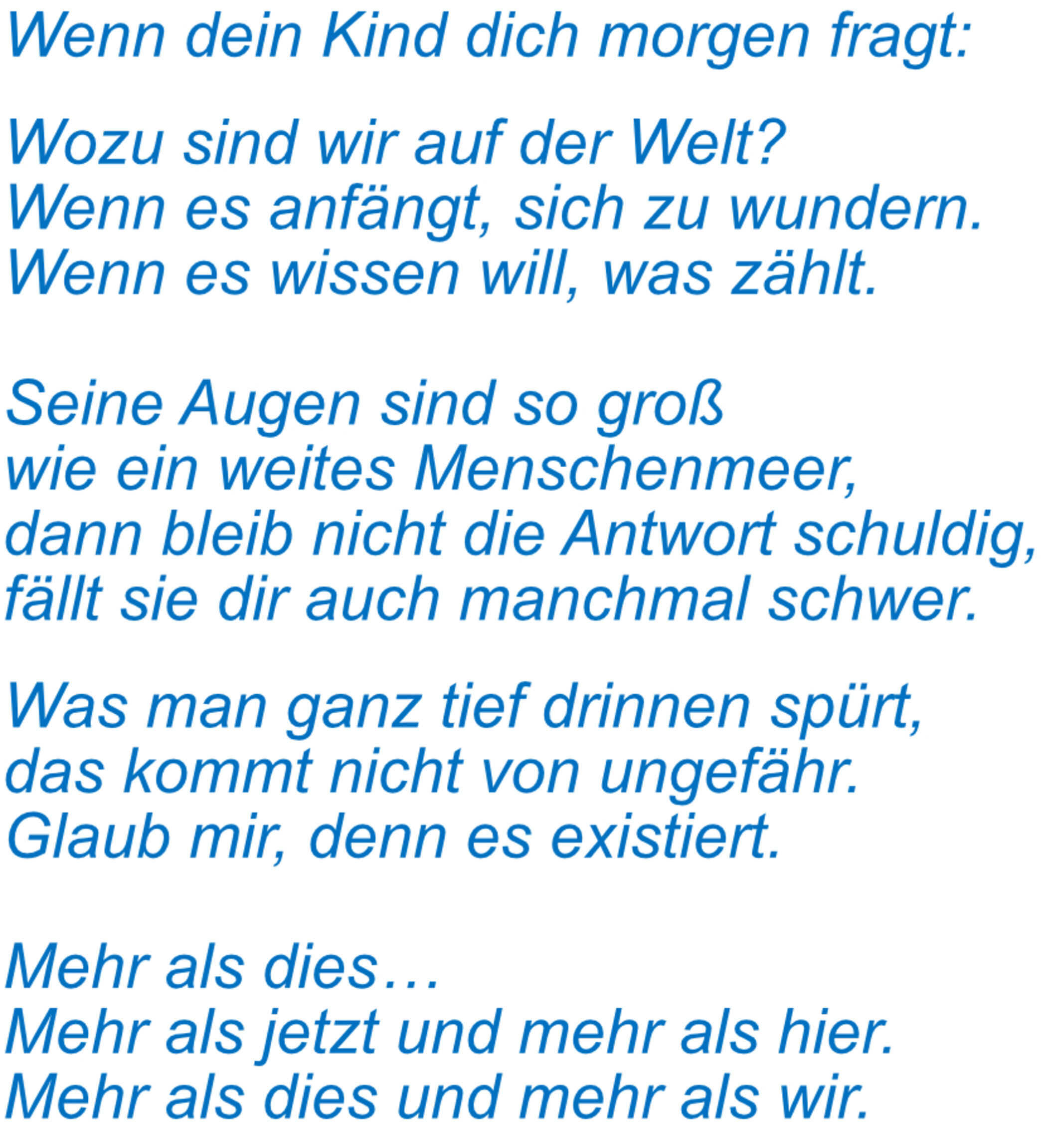 So beginnt ein Lied aus dem Liederheft Lebensweisen, dass zum Kirchentag 2005 erschien. Zu finden ist dieses Lied unter dem Titel „mehr als dies“ und kein geringerer Künstler als Heinz-Rudolf Kunze hat dieses Lied zum damaligen Kirchentag beigesteuert. Das ist nun auch schon wieder 20 Jahre her. In einem Interview sagte er damals, dass er sich bis zum Zeitpunkt der Entstehung dieses Liedes eher als „evangelische Karteileiche“ gesehen hat, zwar nicht ausgetreten, aber auch nicht aktiv. Er kommt zu der Aussage, dass es gut ist, zu seinem Glauben aktiv zu stehen. Die Zugehörigkeit zum Christentum ist für ihn mehr wert als moderne Beliebigkeit. Soweit der Sänger im Jahr 2005.