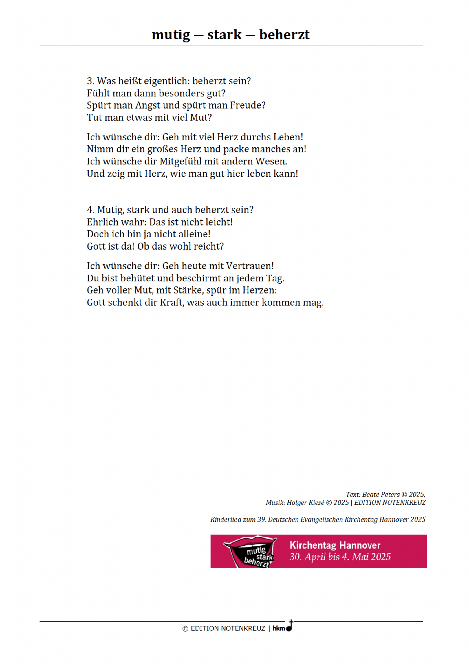 Auf der Kinderseite des Gemeindebriefs für Februar-März findet sich der Text zum Lied „Was ist eigentlich mutig“ von Holger Kiesé (Melodie) und Beate Peters (Text).