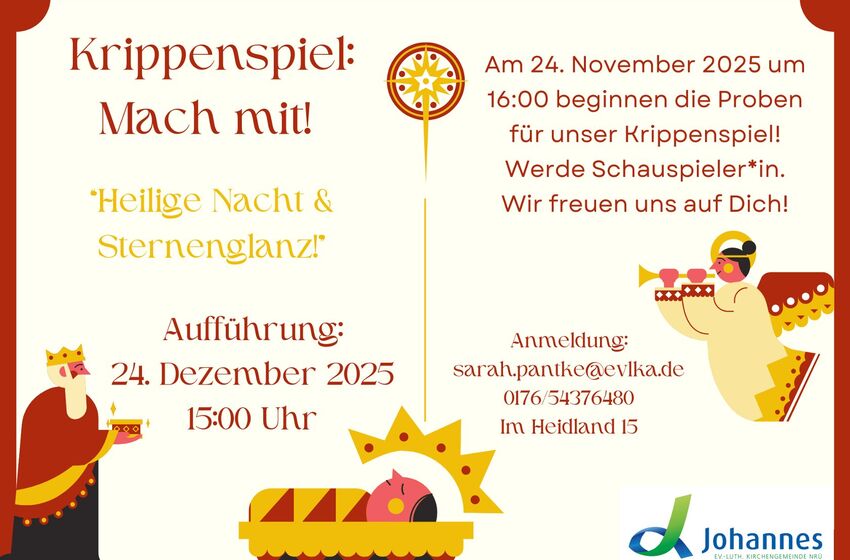 Liebe Kinder, wir suchen noch Schauspieler*innen für unser Krippenspiel am 24.12.2025 um 15:00. Wenn ihr Lust habt mit uns zusammen in die Weihnachtsgeschichte einzutauchen und diesen Abend zu ...
