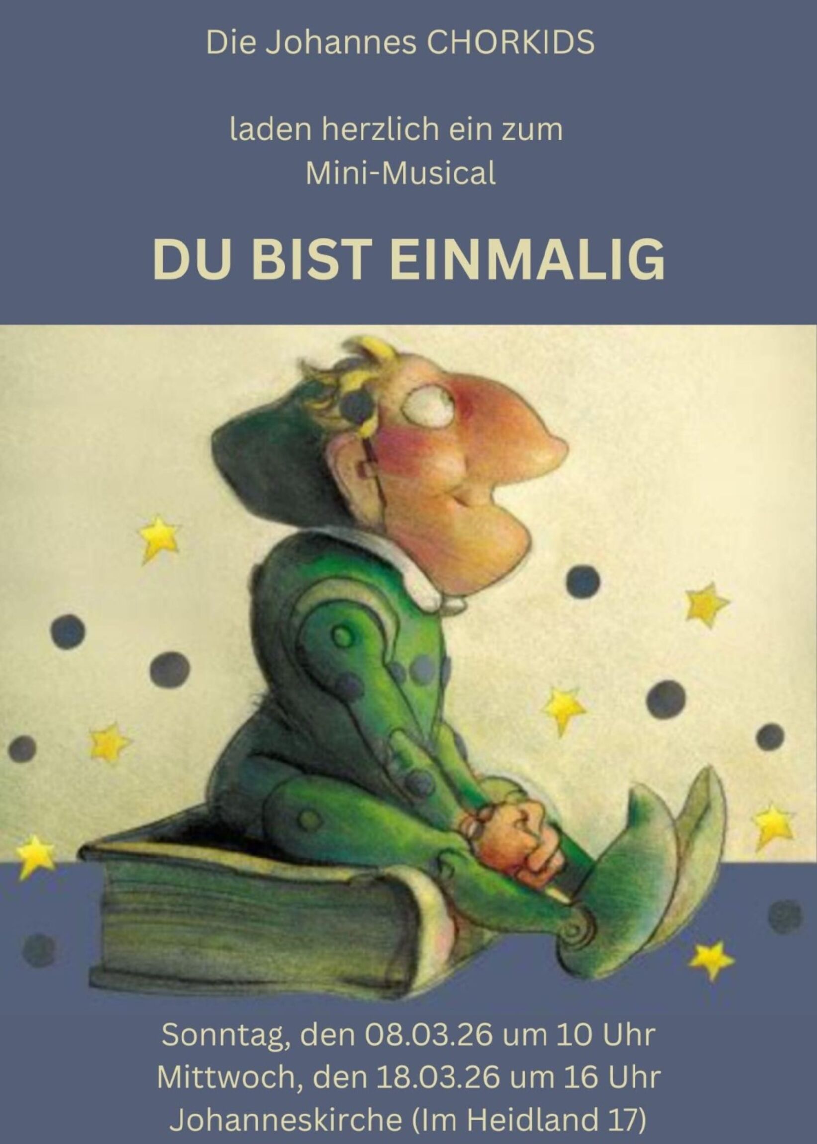 Über vier Monate haben die Johannes CHORKIDS das Mini-Musical "Du bist einmalig" einstudiert. Am Sonntag, den 8. März um 10 Uhr wird das Stück nun im Rahmen eines Familiengottesdienstes aufgeführt, zu dem wir Klein und Groß ganz herzlich einladen. Am Mittwoch, den 18. März, gibt es dann noch einmal eine zweite Aufführung um 16 Uhr .