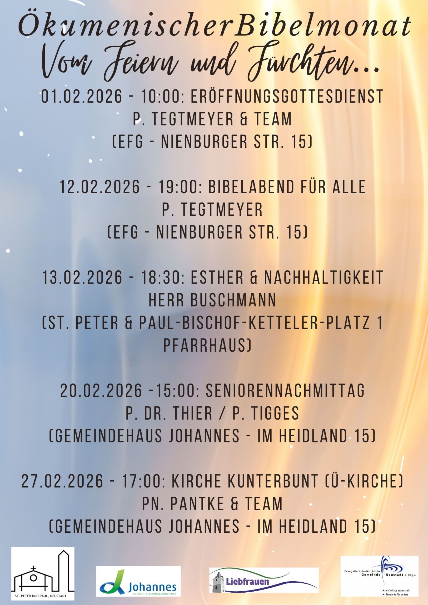 Zusammen mit der katholischen Kirche „St. Peter und Paul“ und der EFG Neustadt machen wir uns wieder auf den Weg der Ökumene. Gemeinsam wollen in diesem Jahr das Buch Esther in den Mittelpunkt unserer Betrachtungen stellen. Eine Schrift, in der Gott gar nicht vorkommt und doch immer dabei ist. Es ermutigt uns auf die Suche Gottes zu gehen und sich die Frage zu stellen: Wo ist und wo bleibt Gott in diesem prallen Leben? Also lassen Sie uns gemeinsam eintauchen in dieses besondere biblische Buch. Kommen Sie zu unseren ökumenischen Veranstaltungen. Wir freuen uns auf Sie.