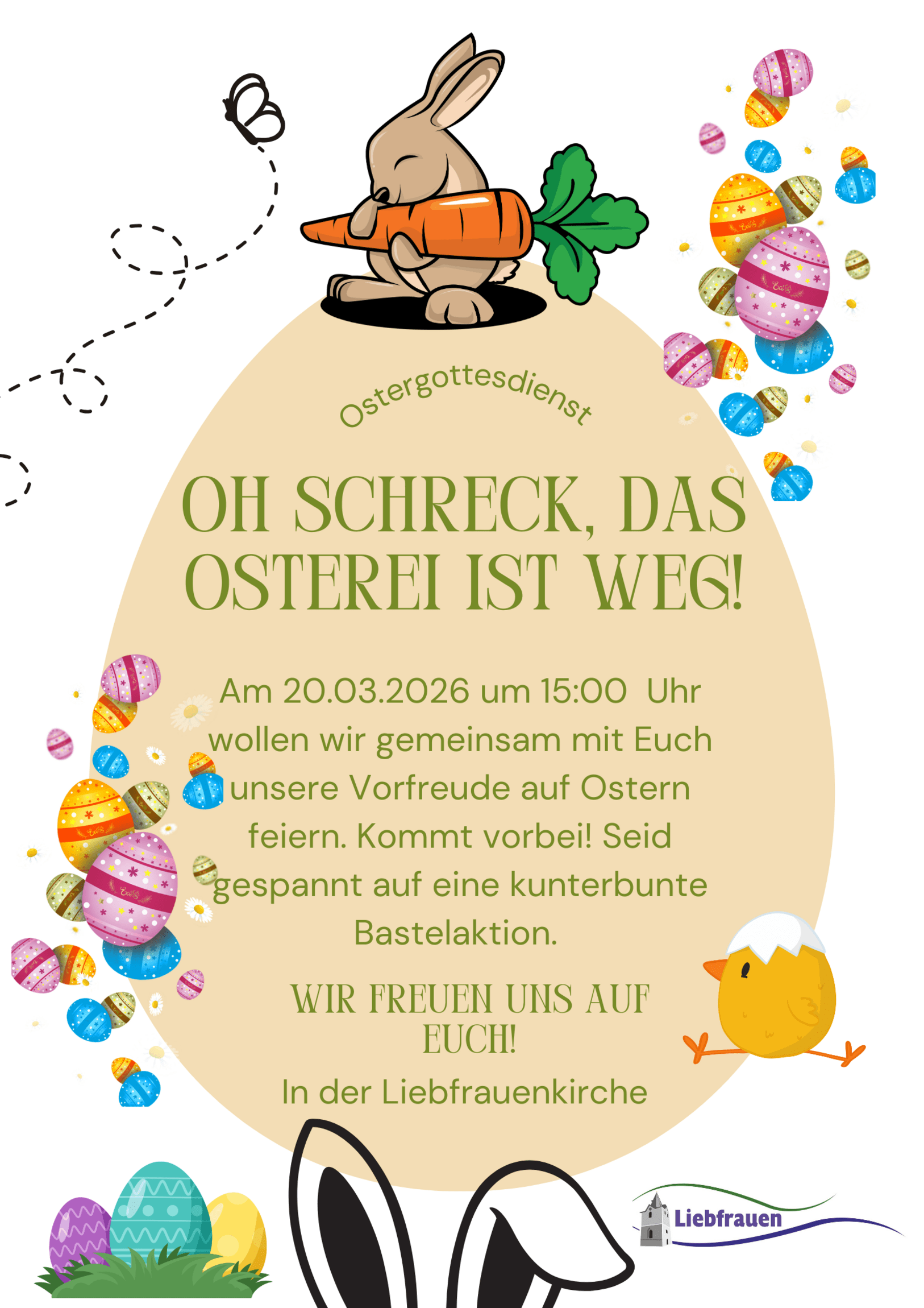 "O Schreck, das Osterei ist weg!" Bastelaktion am 20. März 15-16 Uhr in Liebfrauen Gottesdienst am 2. April 14-15 Uhr in Johannes